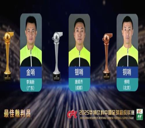 官方:李海新当选2025赛季中超金哨,唐顺齐当选银哨,傅明当选铜哨
